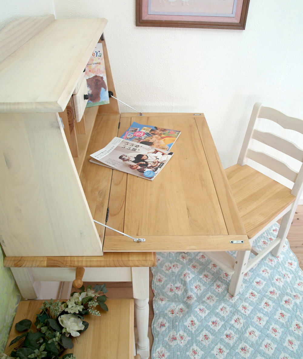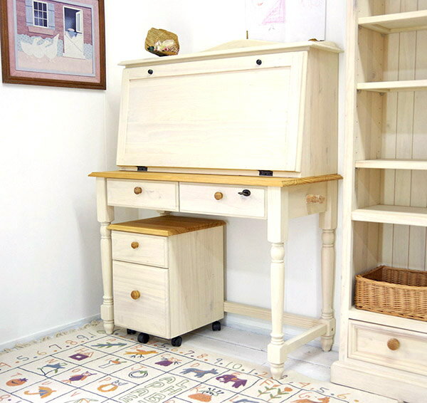 【カントリーライティングデスク/ワゴンチェストセット/パイン木製取っ手/ミルキーホワイト塗装】カントリーパイン学習机/フレンチカントリーライティングデスク/約105cm幅